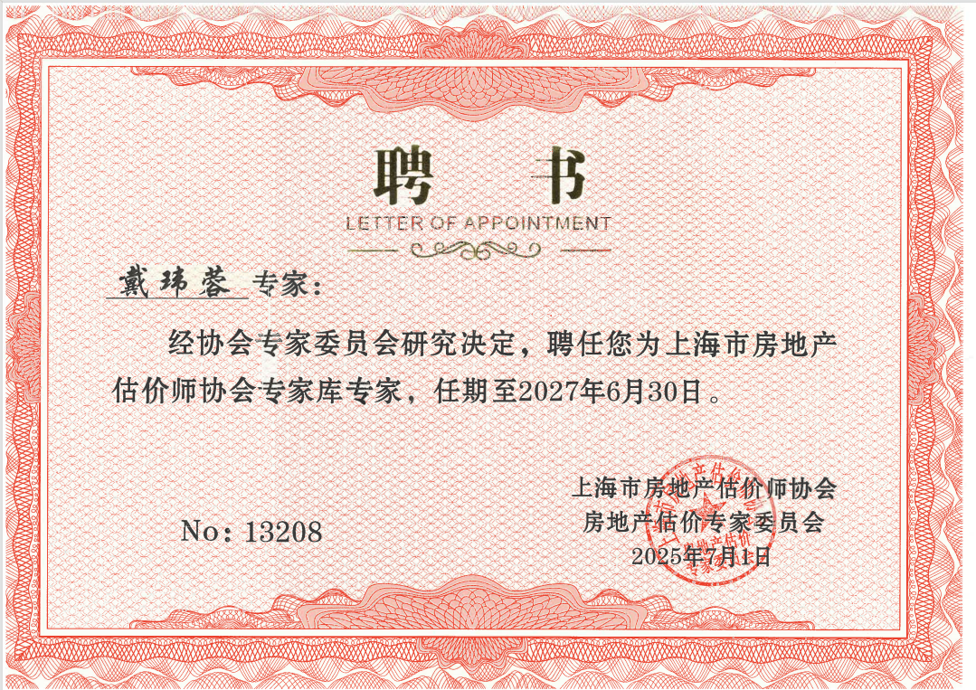 2025年8月,经上海市房地产估价师协会房地产估价专家委员会多轮遴选与考评,联城行戴玮蓉、陈嵘、周玮杰3人获聘为上海市房地产估价师协会专家库专家,其中周玮杰为公司新增专家。